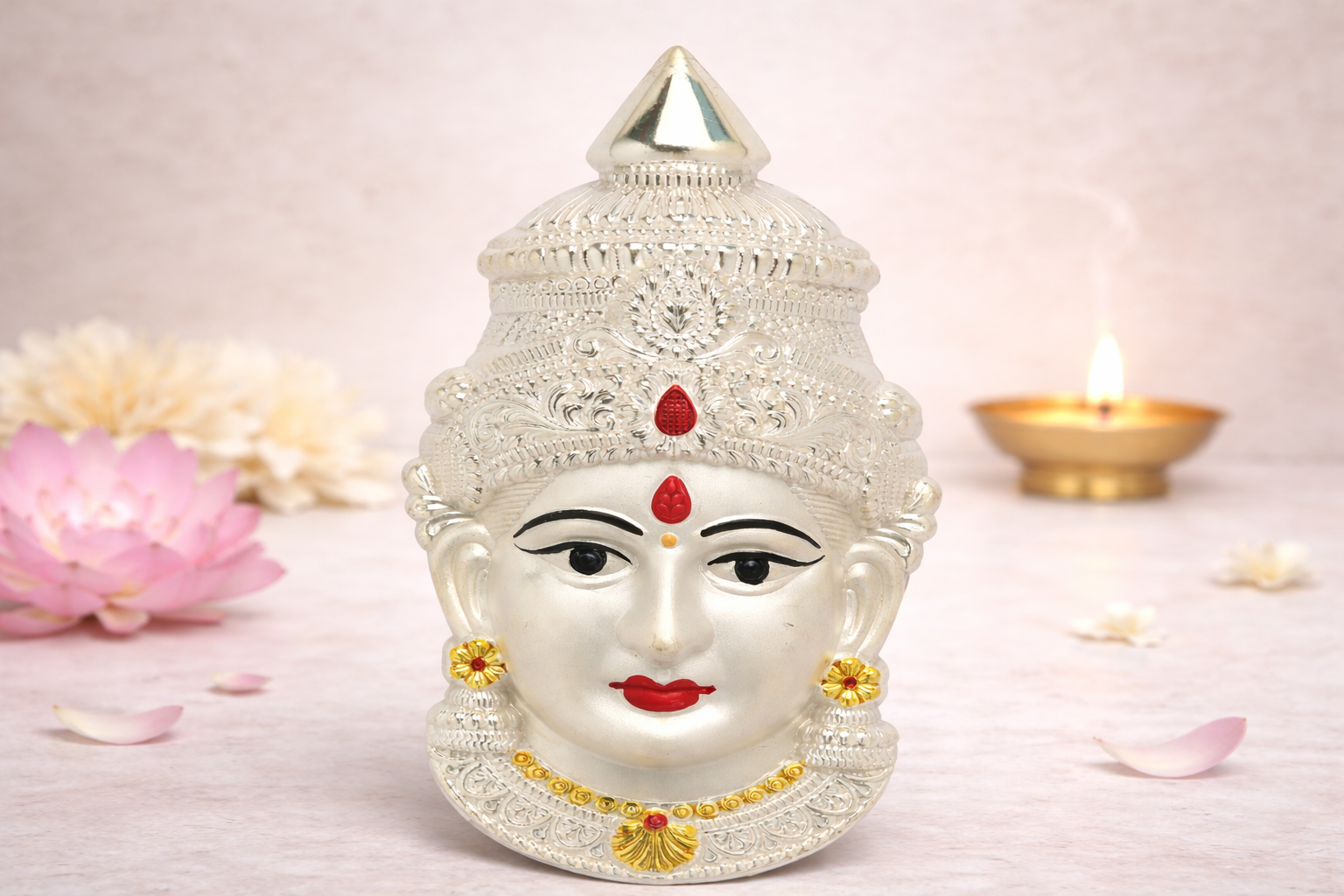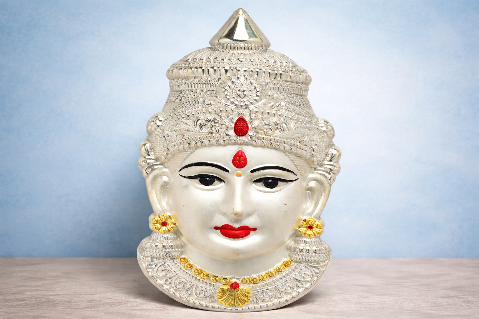 Expertly crafted in 18KT silver, this mukhota features finely detailed facial expressions, symmetrical ornamentation, and a smooth polished finish that preserves the natural brilliance of silver. The design maintains cultural authenticity while offering a refined devotional aesthetic suitable for daily pooja, festive worship, and ceremonial decoration.