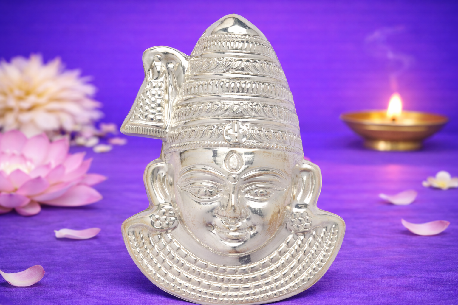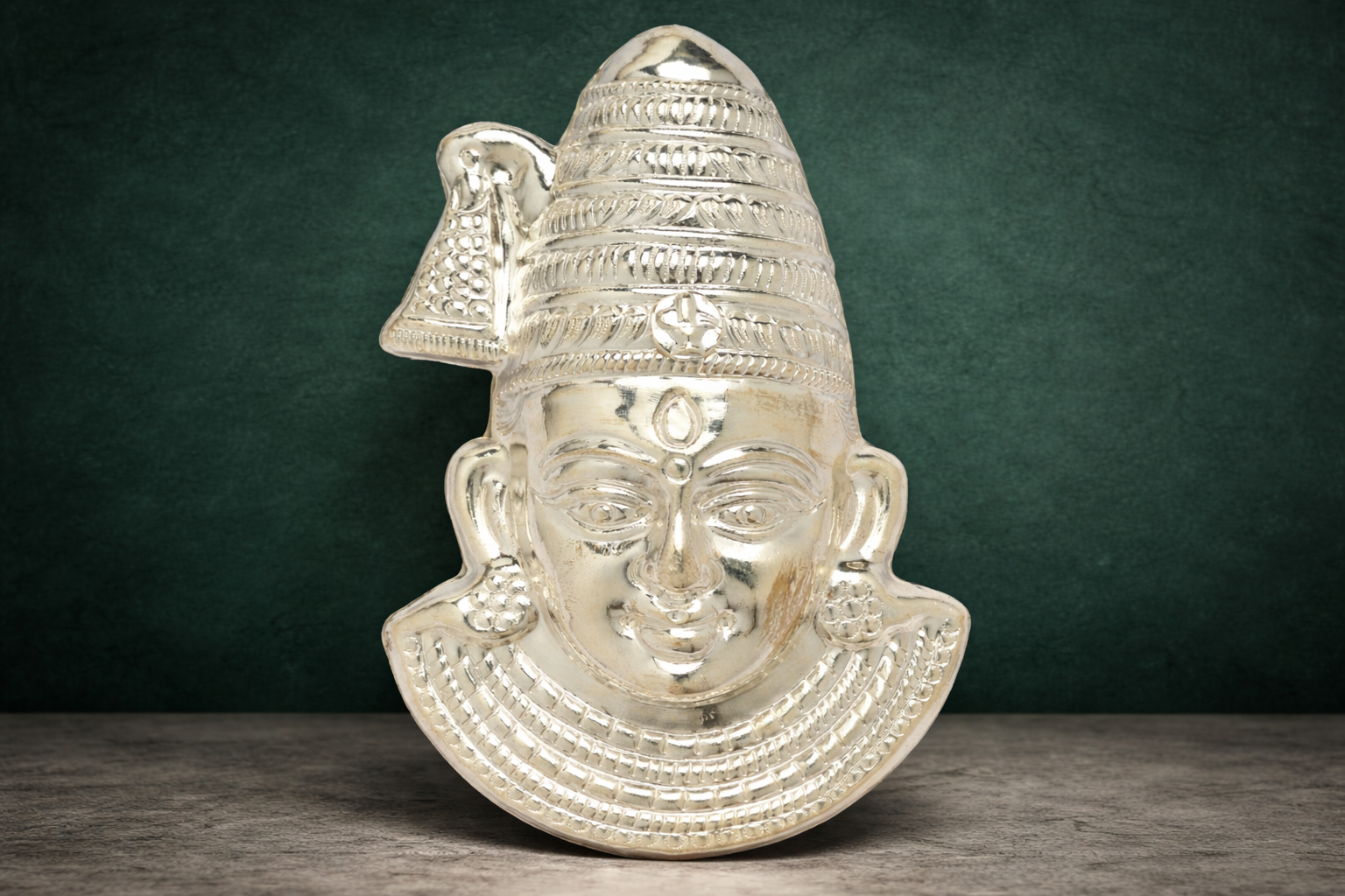 Crafted using premium 18KT silver, this mukhota features finely defined facial expressions, layered crown detailing, and balanced proportions that retain an authentic handcrafted look. The natural silver finish is preserved without artificial enhancement, ensuring true metallic sheen and long-lasting elegance. Its lightweight yet solid construction makes it suitable for daily worship, special pooja ceremonies, and festive installations.
