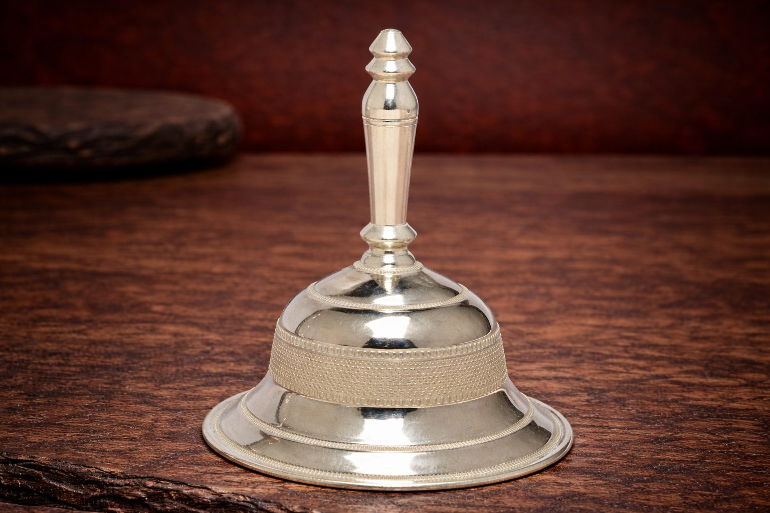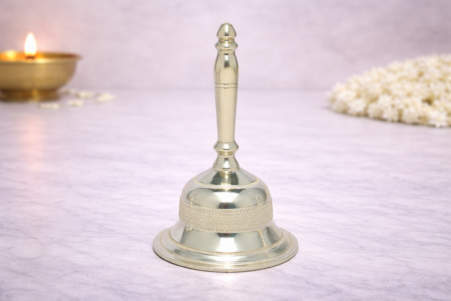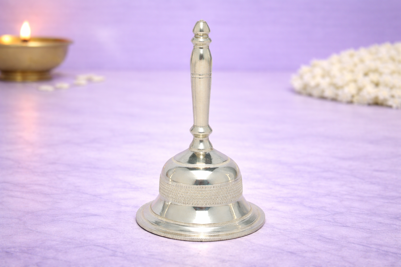 Crafted in 14KT silver purity, the ghanti carries a natural silver finish that retains its authentic metallic sheen without any artificial enhancement. The balanced weight and solid construction ensure durability and comfortable handling, making it suitable for home mandirs, temples, offices, and ceremonial spaces. The detailed nakshi work adds spiritual and aesthetic value, making it ideal for both personal worship and auspicious gifting.