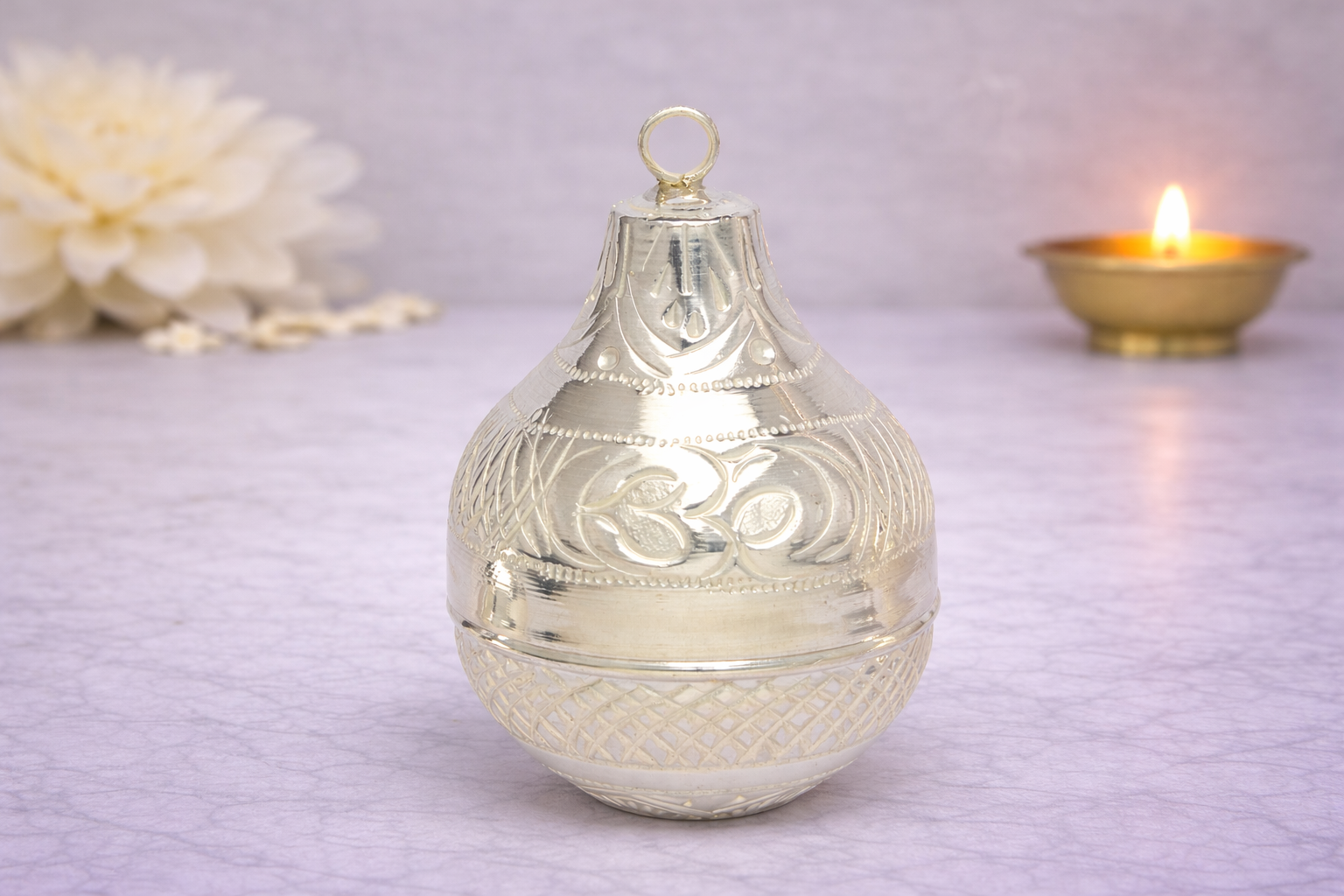 Crafted in 14KT silver purity, the product features a natural silver finish that preserves its genuine metallic sheen without any artificial enhancement. The hollow construction ensures a lighter form while retaining detailed artistry, making it suitable for daily rituals as well as ceremonial use.