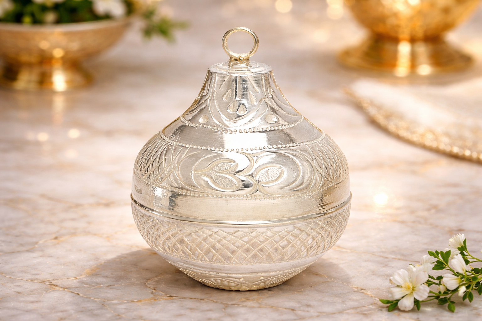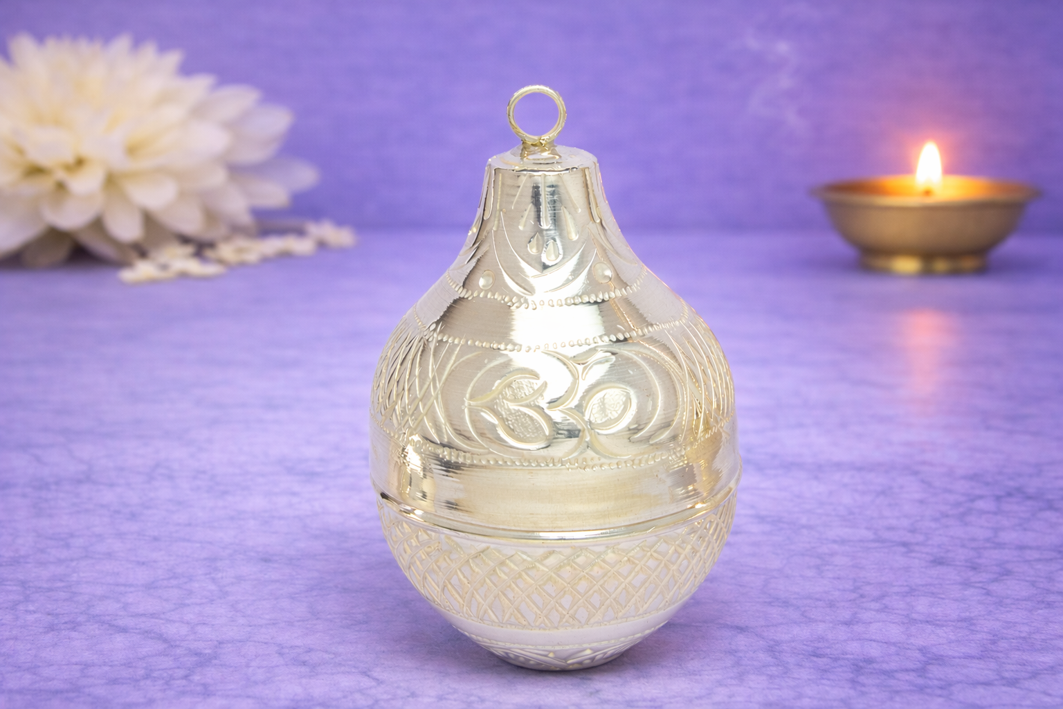 The Nariyal A Silver Kalash is a finely crafted religious article symbolising purity, prosperity, and auspicious beginnings, traditionally used in Hindu rituals, pujas, and ceremonies. Designed in the form of a sacred coconut (Nariyal), this piece represents divine energy and is widely used during festivals, weddings, housewarming ceremonies, and temple offerings.