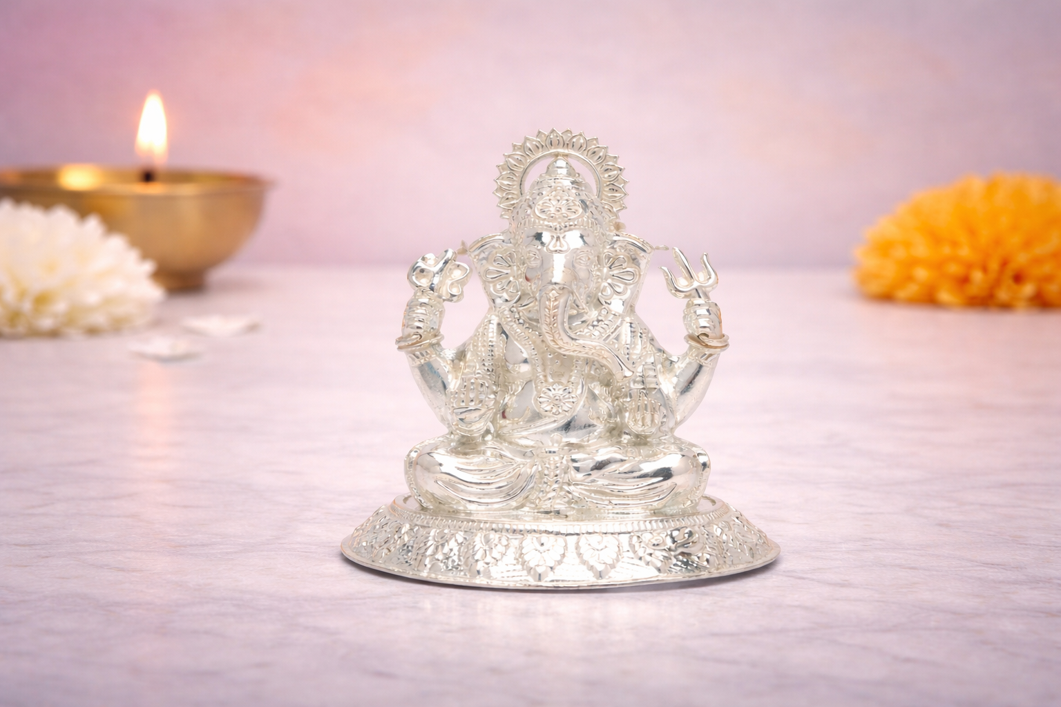Available in a wide range of gram-based weight variants, the Oval Ganpati idol caters to personal worship, gifting, and institutional requirements while maintaining consistent craftsmanship and detailing across all sizes.