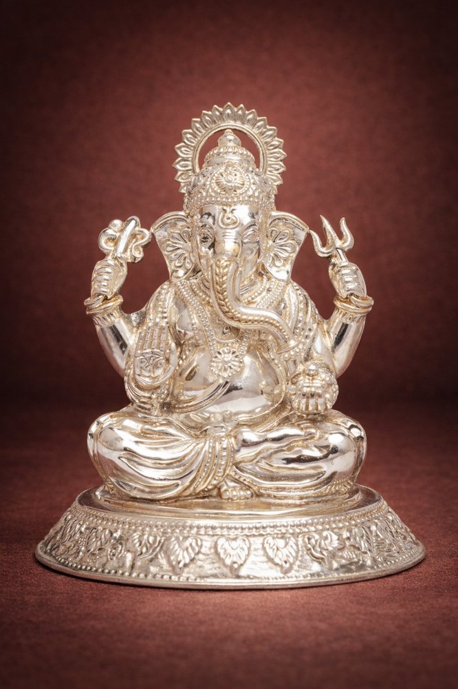 The Oval Ganpati Silver Idol is a finely crafted representation of Lord Ganesha, symbolising wisdom, prosperity, and the remover of obstacles. Seated gracefully on an intricately designed oval base, the idol showcases refined detailing across the crown, facial features, ornaments, and symbolic attributes, reflecting traditional craftsmanship with spiritual elegance.