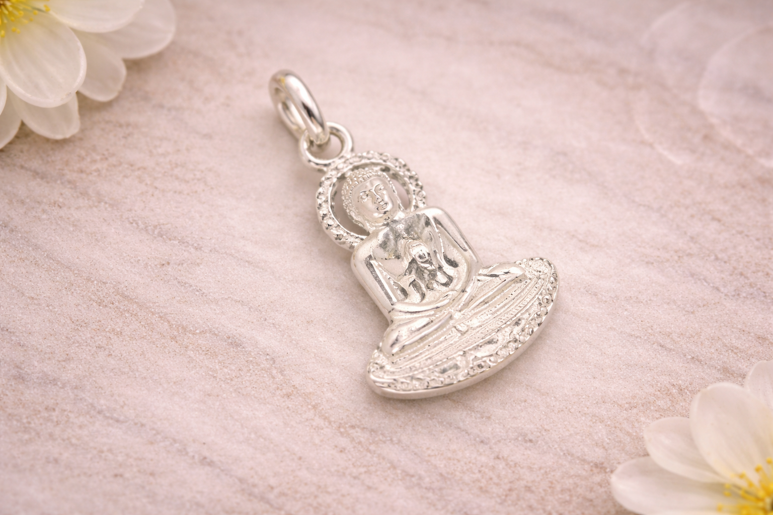 The Pendant U Silver Religious Pendant is a serene devotional jewellery piece inspired by classical Buddhist iconography. Featuring a finely sculpted seated Buddha form resting on a layered lotus base, this pendant symbolizes peace, mindfulness, and spiritual balance. The calm facial expression and symmetrical detailing give it a composed and elegant presence.