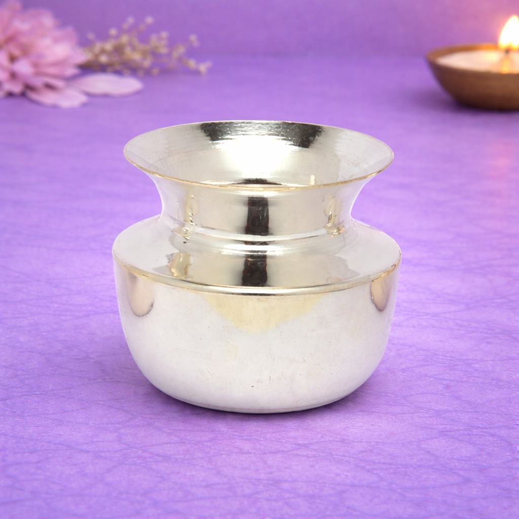 Expertly crafted in 14KT silver purity, the Plain Lota showcases a natural silver finish that maintains its authentic shine and durability. Its balanced structure and wide mouth make it ideal for ritual water offerings, abhishek ceremonies, puja rituals, and temple use, while also being suitable for household religious practices.