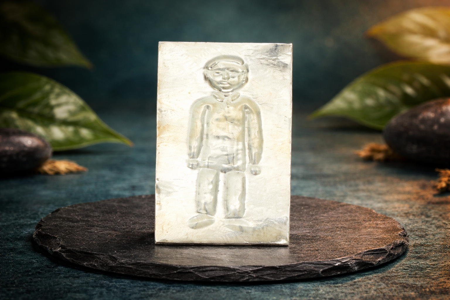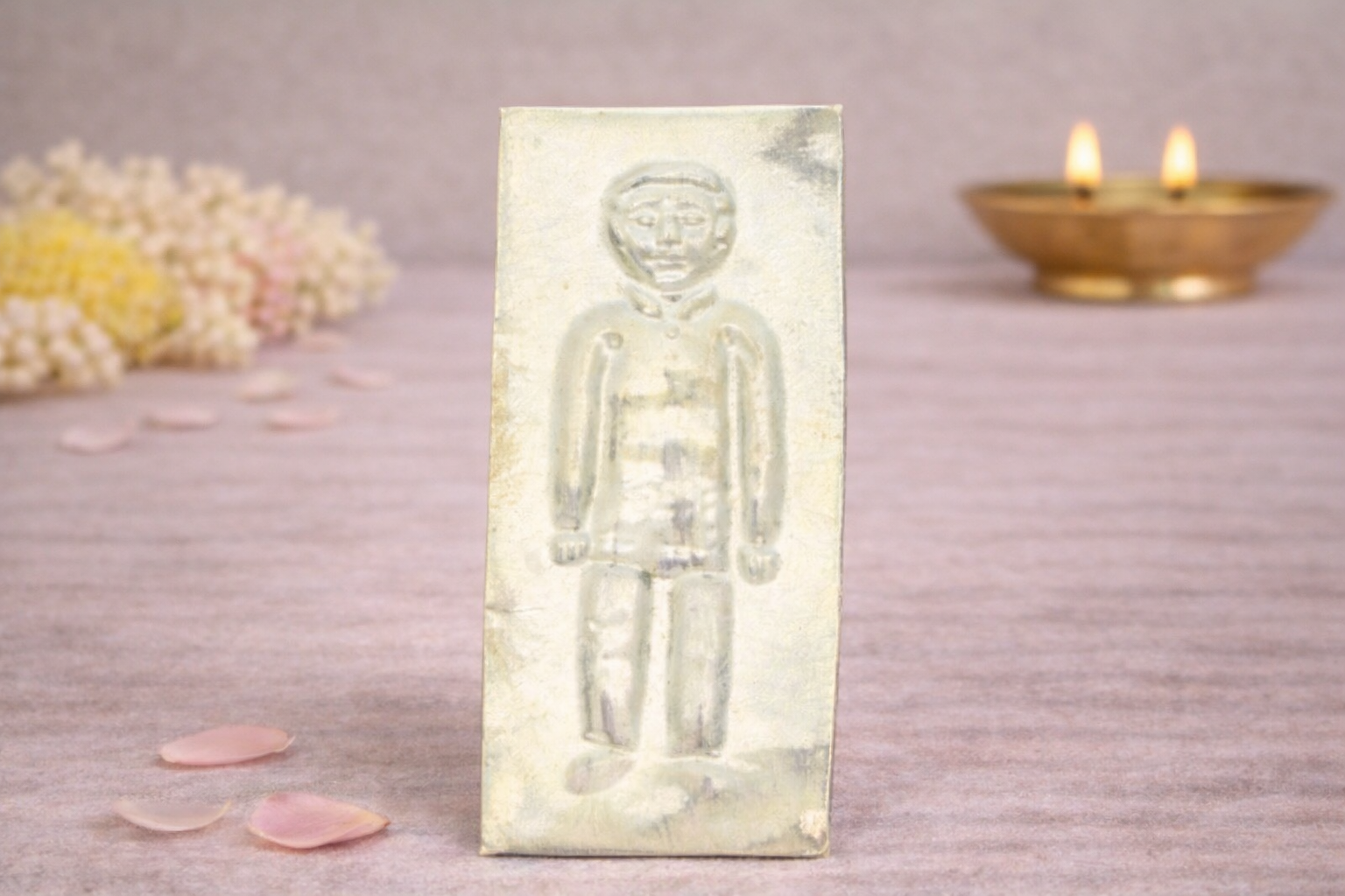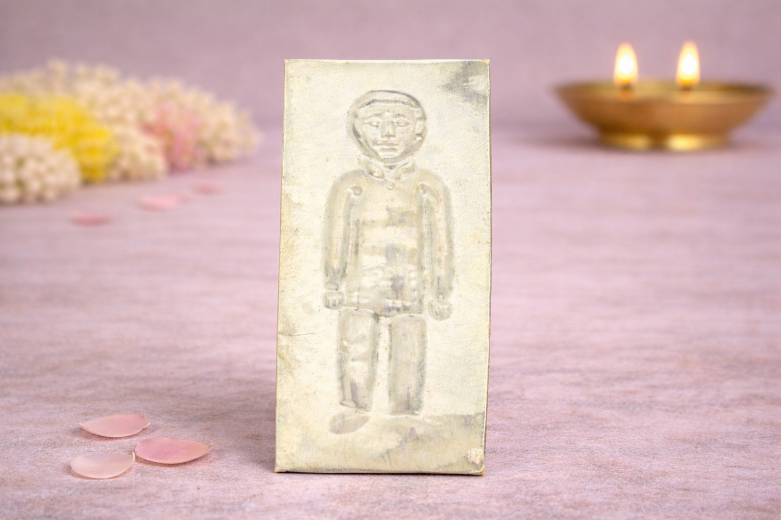The Purush Silver Yantra is a symbolic religious article representing human form, presence, and spiritual balance as interpreted in traditional yantra practices. The engraved human figure signifies consciousness, grounding, and the alignment of physical and spiritual existence, making it a meaningful addition to devotional rituals and sacred spaces.
