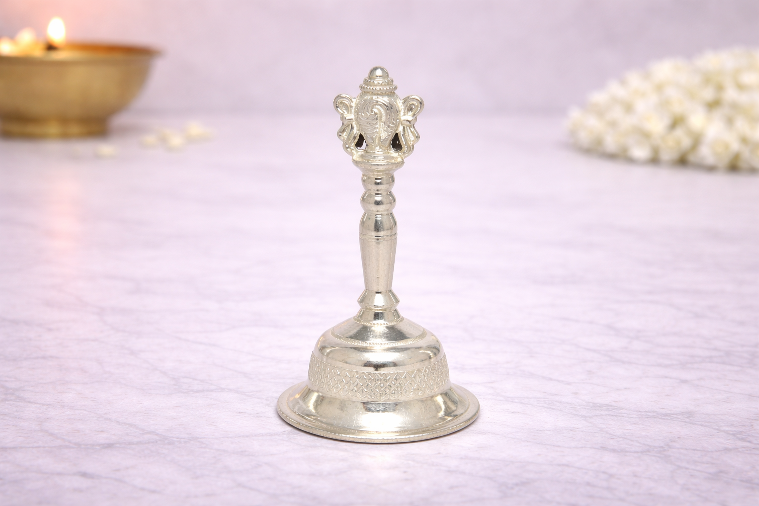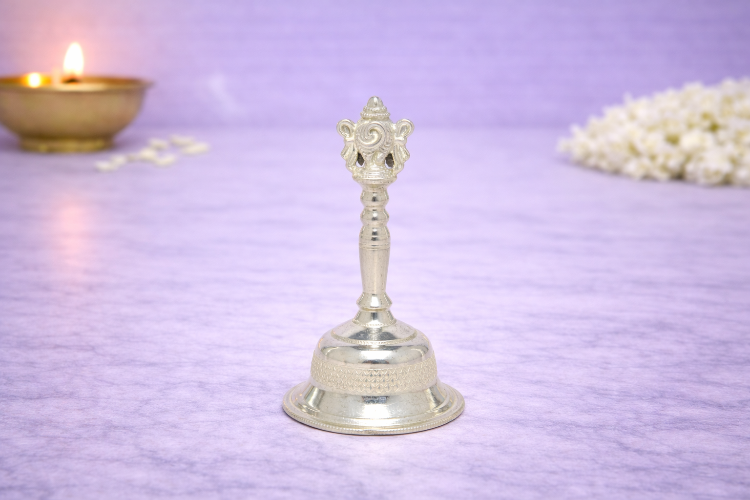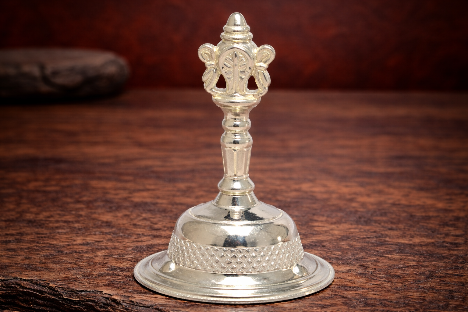 Crafted in 14KT silver purity, this ghanti features a natural silver finish that preserves its authentic metallic brilliance without any artificial enhancement. The well-balanced form ensures a comfortable grip and a clear, resonant sound, making it ideal for regular use in home mandirs, temples, and ceremonial worship. Fine detailing on the handle and base reflects skilled craftsmanship rooted in traditional silversmithing.