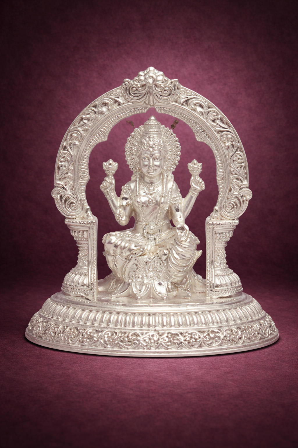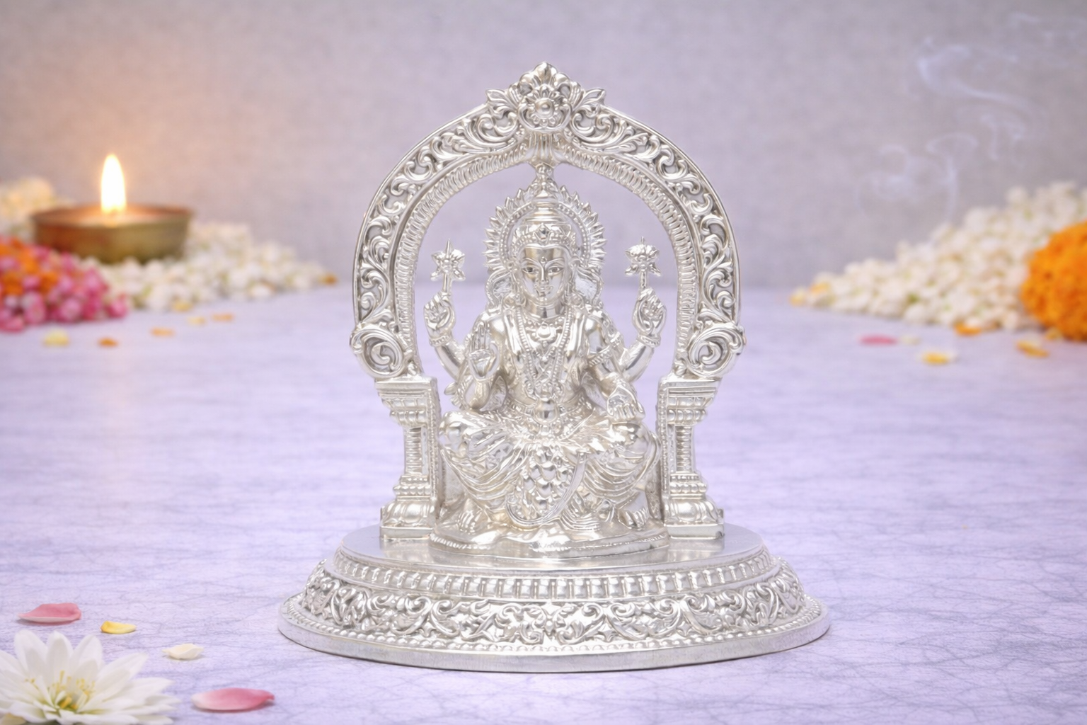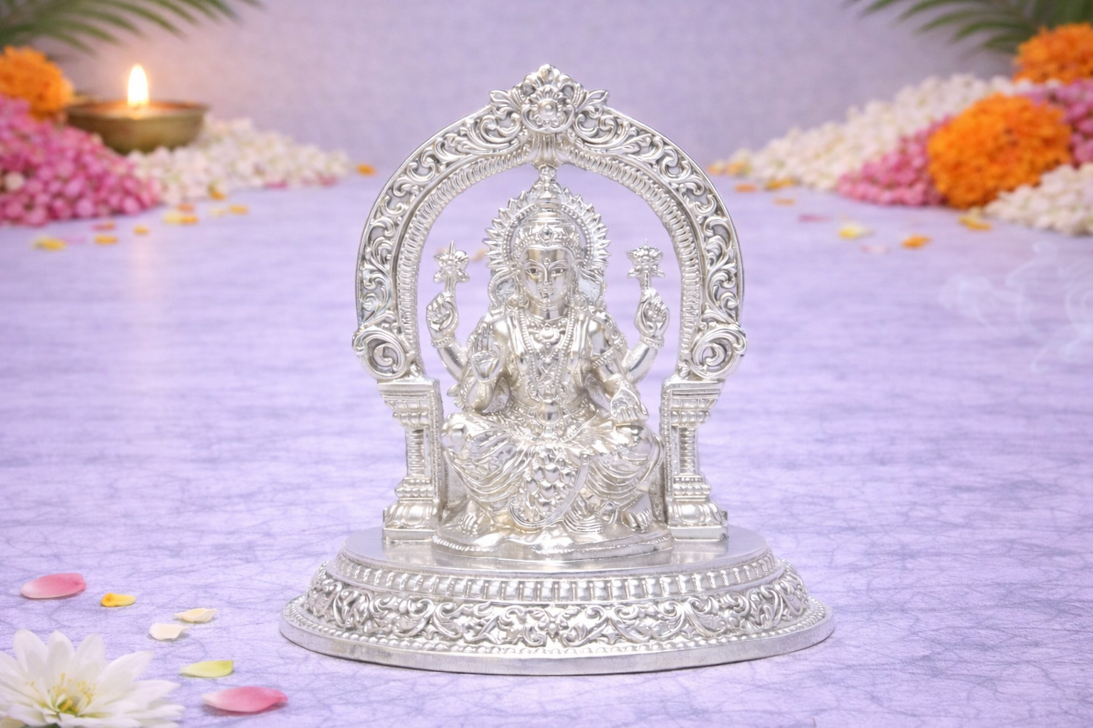 The Singhasan Laxmi Idol is a finely crafted silver idol symbolising wealth, prosperity, and divine grace. Seated gracefully on an ornate singhasan (throne), Goddess Lakshmi is depicted with intricate detailing that reflects traditional craftsmanship and spiritual elegance. This idol is ideal for daily पूजा, festive rituals, Diwali worship, and auspicious ceremonies, adding a sacred and refined presence to any home temple or office space.