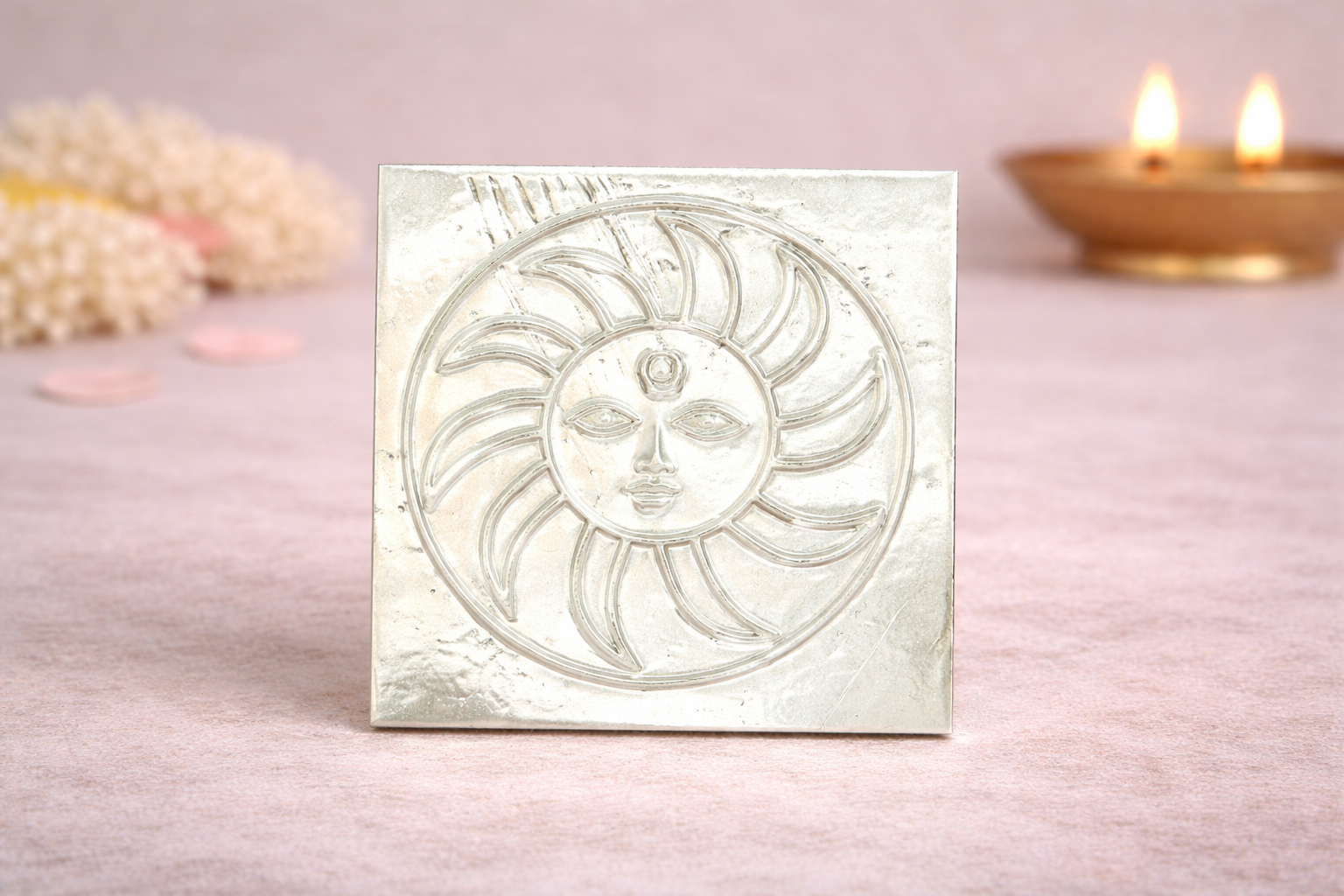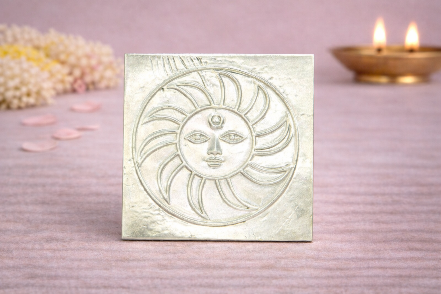The Surya Silver Yantra is a spiritually revered religious article symbolising vitality, strength, clarity, and divine illumination. Representing Surya Dev (the Sun God), this yantra is traditionally worshipped to invoke positive energy, health, success, and inner balance. The embossed sun motif with radiating rays reflects power, awareness, and cosmic order, making it an auspicious element in daily worship and sacred rituals.