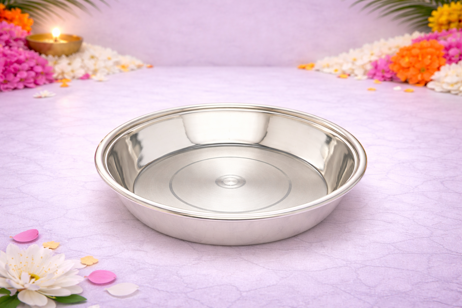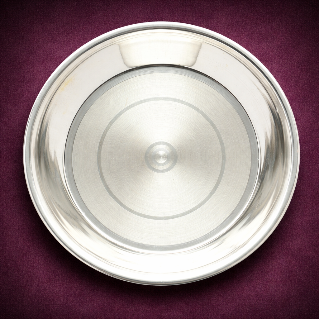 Its balanced proportions and polished surface ensure ease of handling while enhancing the presentation of offerings, prasad, or meals. Available in multiple weight options, the Taman Plate caters to varied needs—from compact personal use to larger ceremonial settings. A perfect blend of simplicity, tradition, and premium quality, this plate adds grace and authenticity to any setting.