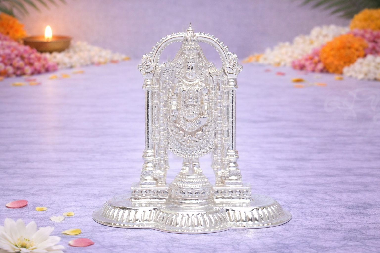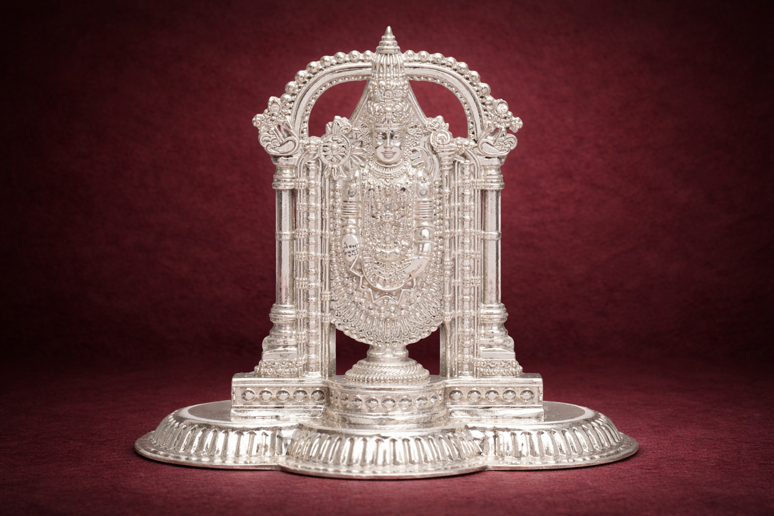 The Tirupati Balaji Casting Silver Idol is a finely crafted representation of Lord Venkateswara, symbolising prosperity, devotion, and divine grace. Meticulously produced using high-quality casting techniques, this idol showcases intricate detailing—from the ornate arch and sacred ornaments to the serene facial expression—reflecting traditional temple artistry with refined precision.