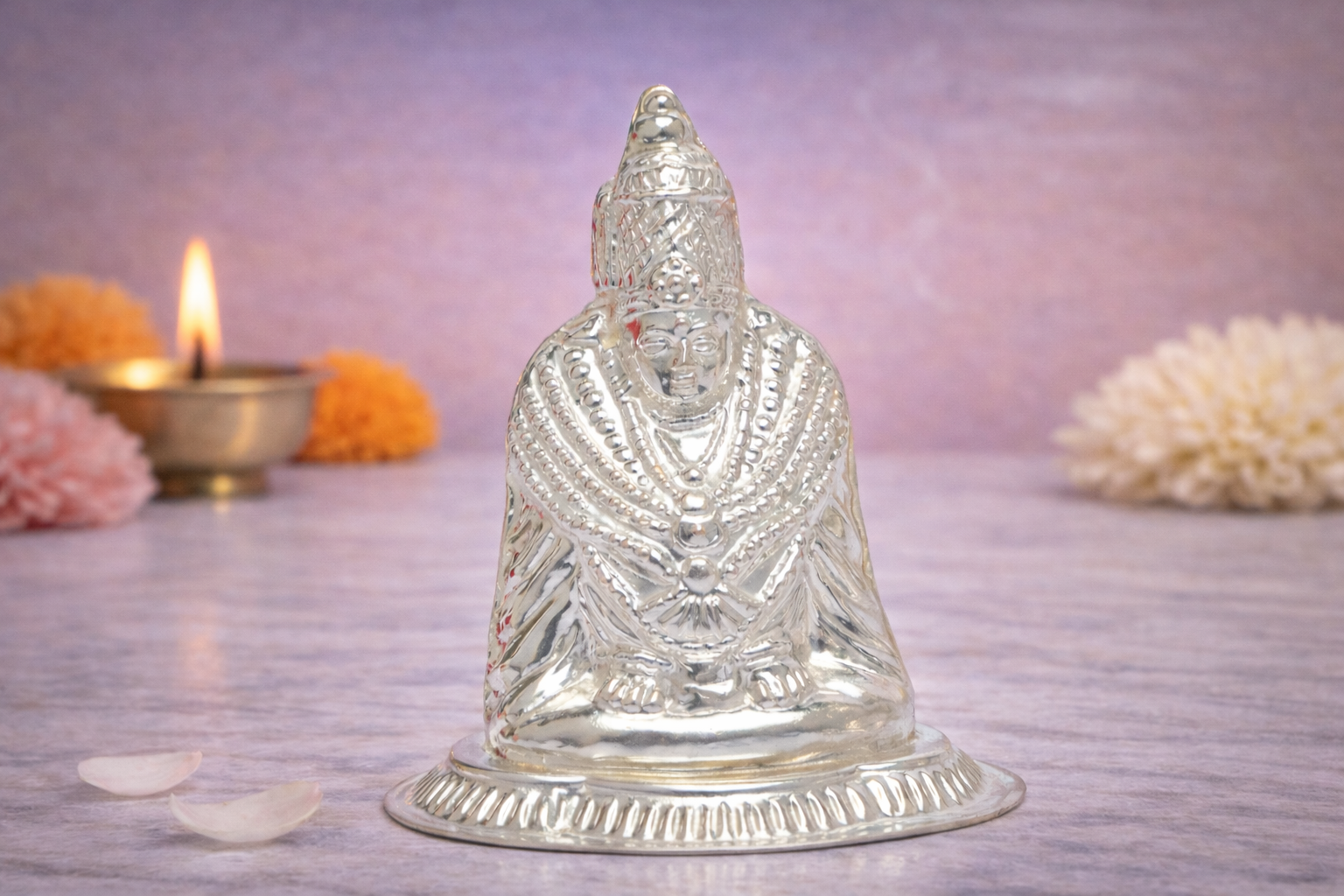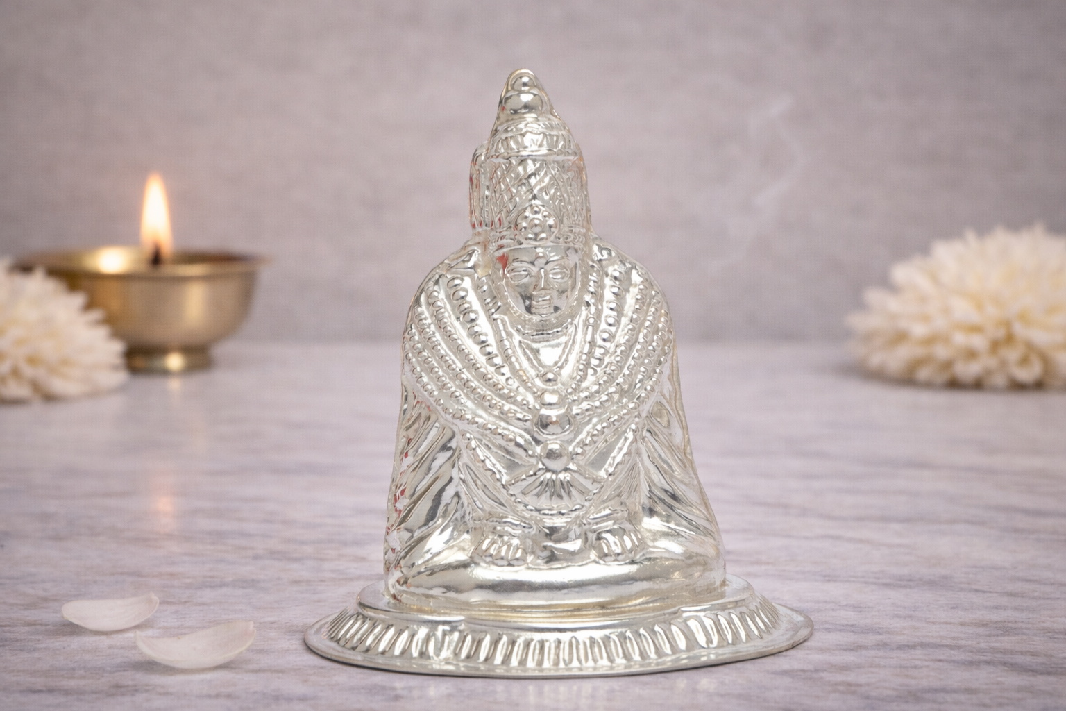 The Tulja Bhavani Silver Idol is a finely crafted representation of Goddess Tulja Bhavani, revered as a powerful symbol of strength, protection, and divine energy. Depicted in a composed seated posture, this idol reflects devotion and grace, with intricate detailing across the facial features, crown, ornaments, and attire, showcasing refined craftsmanship inspired by traditional temple artistry.